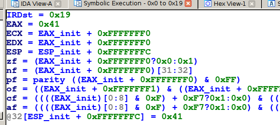If you don’t want to bother writing Python code only to run a symbolic execution, the script miasm/example/ida/symbol_exec.py will do the trick. Under IDA, hit Alt-F7 and run the script. Now, select the code you want to execute and hit F3.