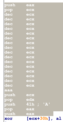 Note the PUSH EAX POP ECX to mimic a MOV ECX, EAX, keeping a pure ascii encoding. As we can see, the shellcode starts with some computations, and will xor a memory cell: